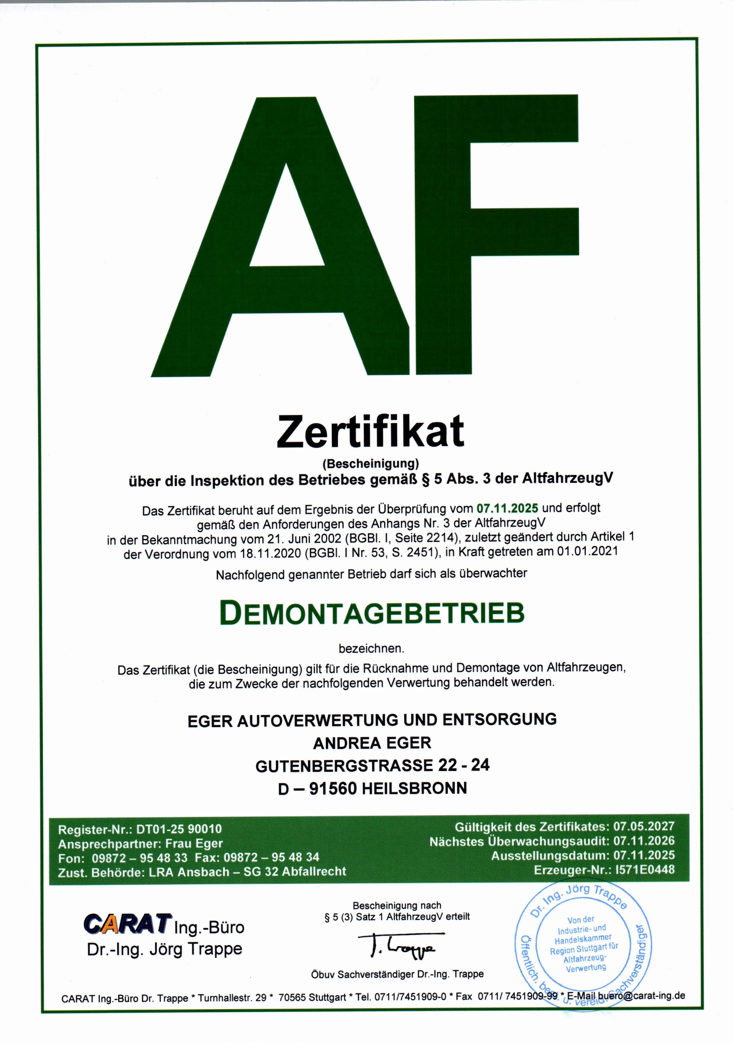 Wir entsorgen Ihr Altfahrzeug umwelt- und fachgerecht, da wir ein "überwachter Demontagebetrieb" nach § 5 Abs. 3 der Altfahrzeugverordnung sind und jährlich neu zertifiziert werden.